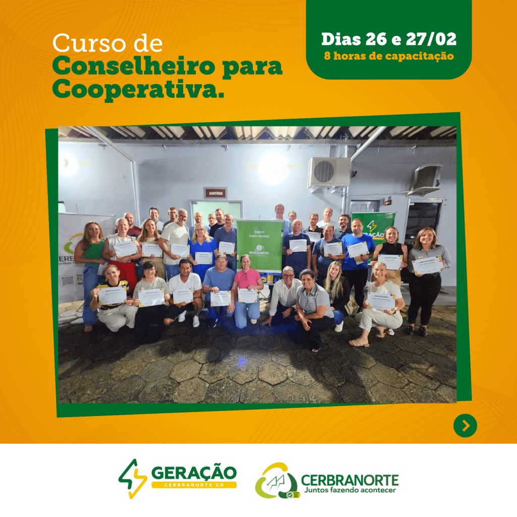 A Cerbranorte, alinhada aos seus valores de transparência e comprometimento com o crescimento coletivo, concluiu com grande êxito o Curso de Conselheiro para Cooperativa. A formação, parte integrante do regimento interno que preconiza a qualificação dos interessados em cargos eletivos, reuniu associados engajados que, sob a tutela do Sescoop, mergulharam nos princípios e práticas do cooperativismo.