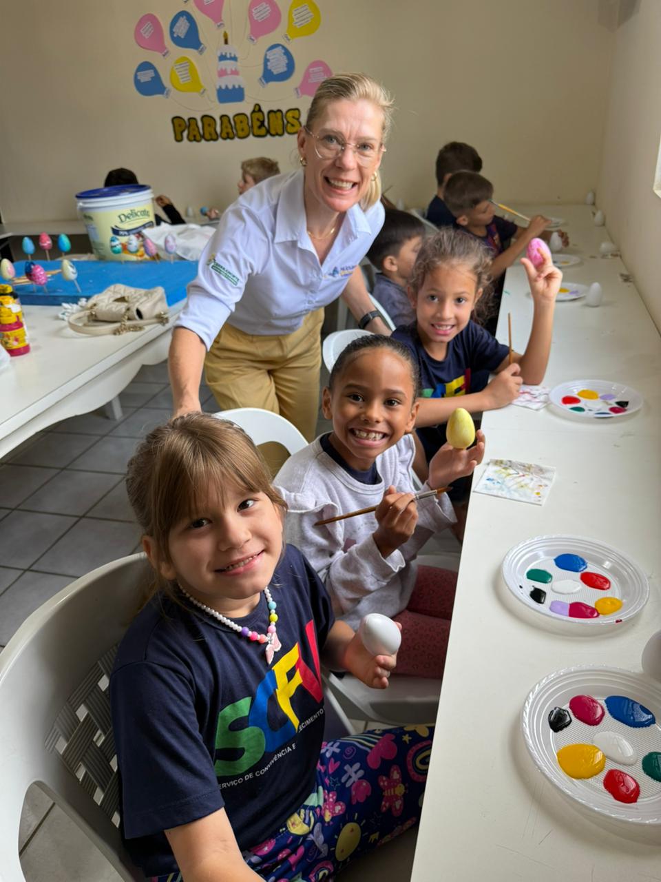 A atividade teve como principal objetivo compartilhar com as crianças o verdadeiro significado da Páscoa. Em um primeiro momento, foi contada a história da Páscoa e da ressurreição de Jesus, reforçando valores como amor, esperança, solidariedade e renovação.