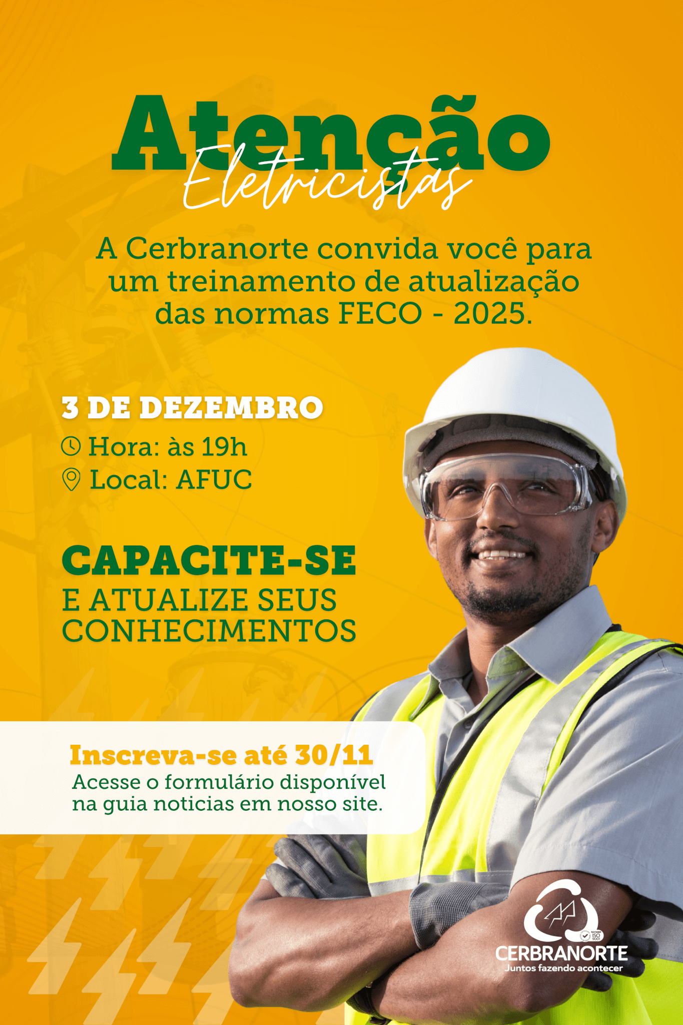 A Cerbranorte está sempre comprometida com a qualidade e segurança dos serviços prestados aos seus associados e, para isso, promove continuamente capacitações para sua equipe e parceiros. No dia 3 de dezembro de 2024, às 19h, a Cerbranorte realizará um Treinamento Técnico exclusivo para eletricistas terceirizados, com o objetivo de alinhar as práticas de trabalho às normas técnicas exigidas pela Fecoerusc, a Federação das Cooperativas de Eletrificação. O evento acontecerá na AFUC, em Braço do Norte.