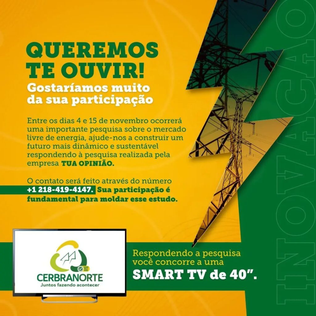 Os associados que responderem à pesquisa até o final estarão concorrendo a uma Smart TV de 40”. A Cerbranorte acredita que essa é uma oportunidade de construir um setor de energia mais sustentável, dinâmico e com opções tarifárias que atendam melhor às necessidades de seus associados.