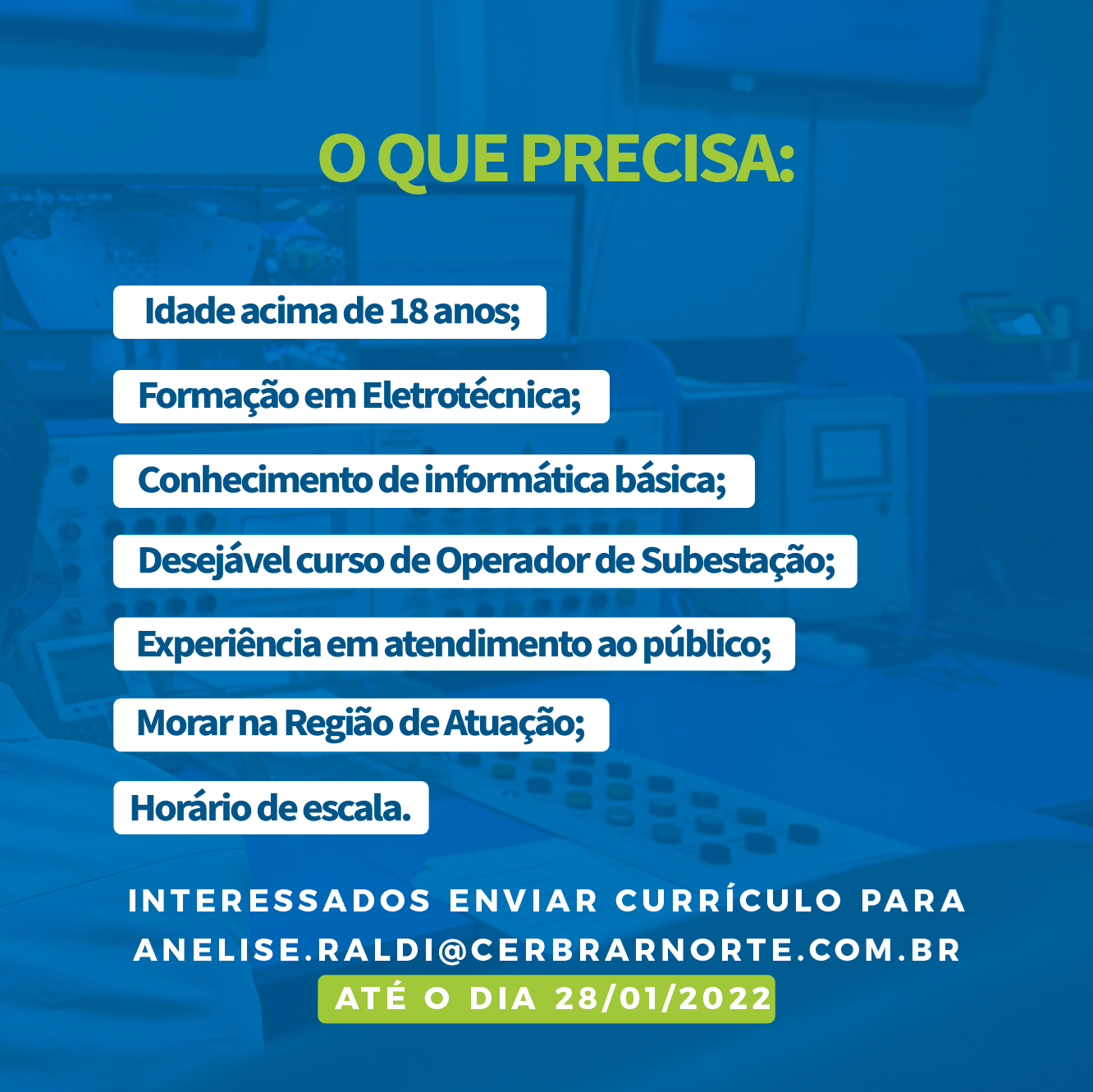 Desejável curso de Operador de Subestação.