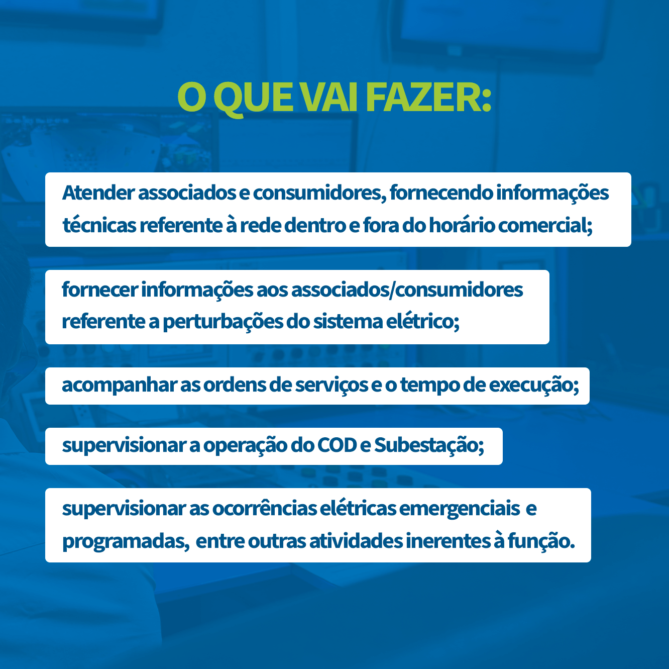 Atender associados e consumidores, fornecendo informações técnicas referente à rede dentro e fora do horário comercial; fornecer informações aos associados/consumidores referente a perturbações do sistema elétrico; acompanhar as ordens de serviços e o tempo de execução dos mesmos; supervisionar a operação do COD e Subestação; supervisionar as ocorrências elétricas emergenciais e programadas, entre outras atividades inerentes à função.