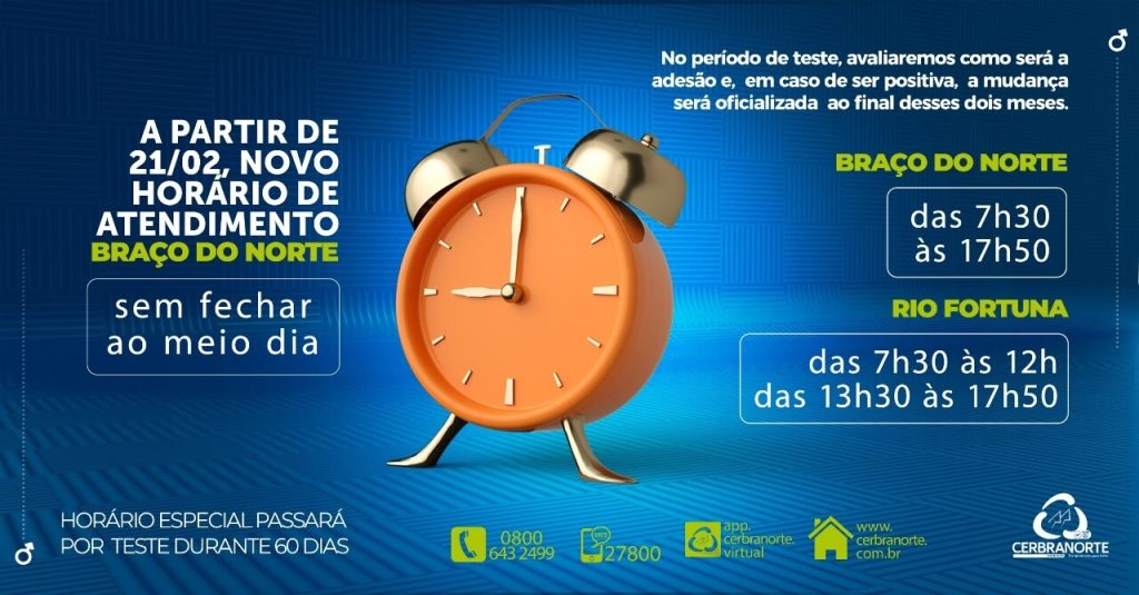 Fique atento e programe-se! O horário estendido em Braço do Norte será das 7h30min às 17h50, sem fechar ao meio dia. Enquanto a sede de Rio Fortuna será aberta das 7h30min ao 12h e da 13h30min às 17h50. Além desta novidade, estão sendo realizados outros estudos e pesquisas para ampliar a gama de serviços ofertados através dos canais digitais da Cerbranorte.