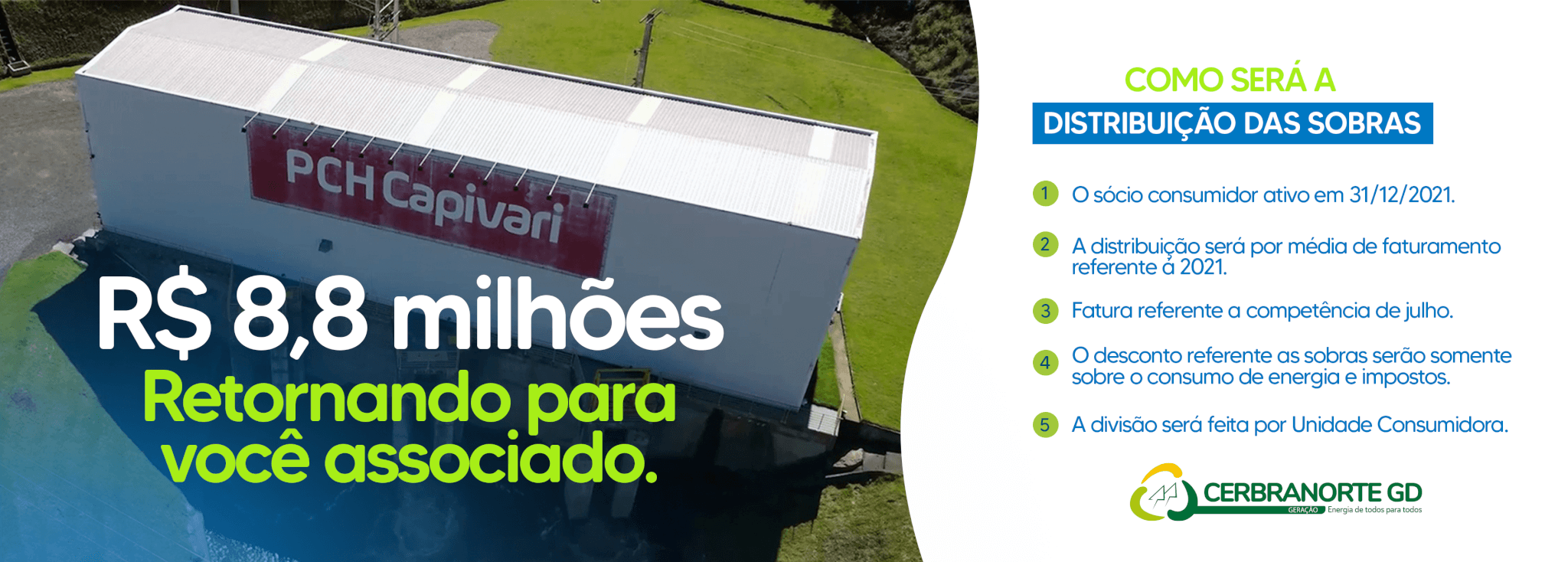 Na última semana o Conselho de Administração da Cerbranorte Geração definiu como ocorrerá o rateio das sobras aos consumidores. A deliberação para esse repasse, um total de R$ 8.859.533,11, se deu na Assembleia Geral Ordinária, realizada no dia 30 de março de 2022, em Rio Fortuna. Conforme a nova decisão, o valor devolvido em agosto, referente ao mês de julho, corresponderá a uma média dos 12 meses de 2021 de cada UC (Unidade Consumidora), chegando a uma fatura, ou mais, de desconto.